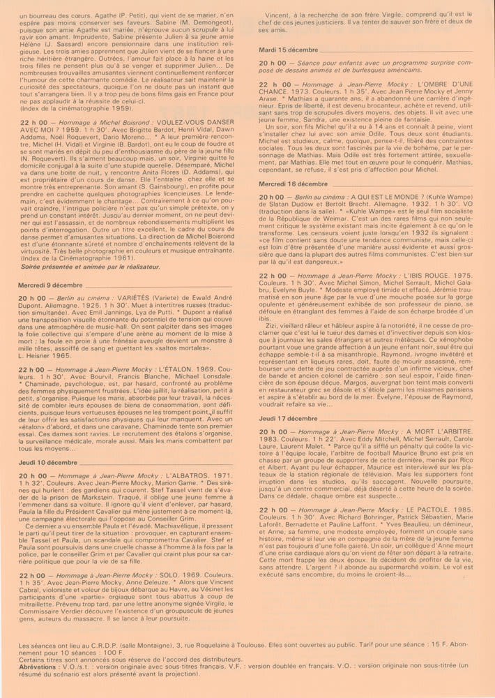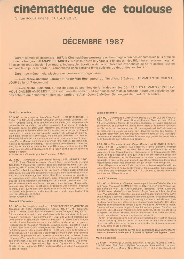 Décembre 1987. Hommage à Jean-Pierre Mocky. Anthologie du cinéma. Théâtre et cinéma. Hommage à Michel Boisrond. Berlin au cinéma