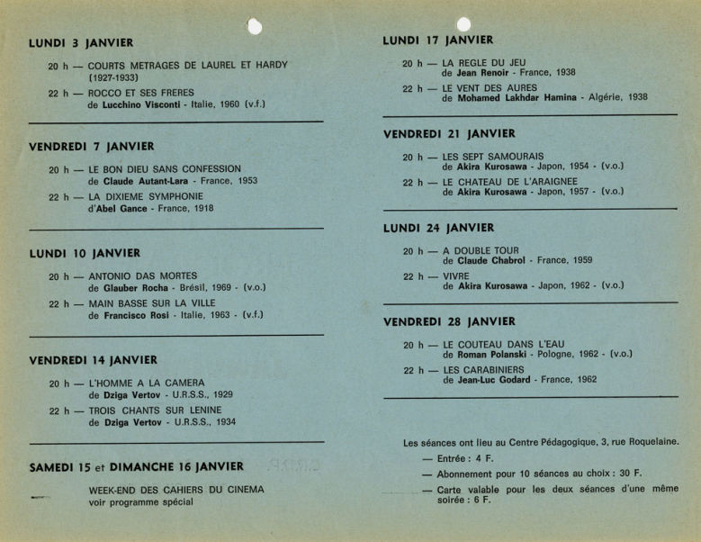 Themes : Cinéma polonais, Cinéma soviétique, Cinéma italien, Cinéma japonais, Cinéma américain, Cinéma français