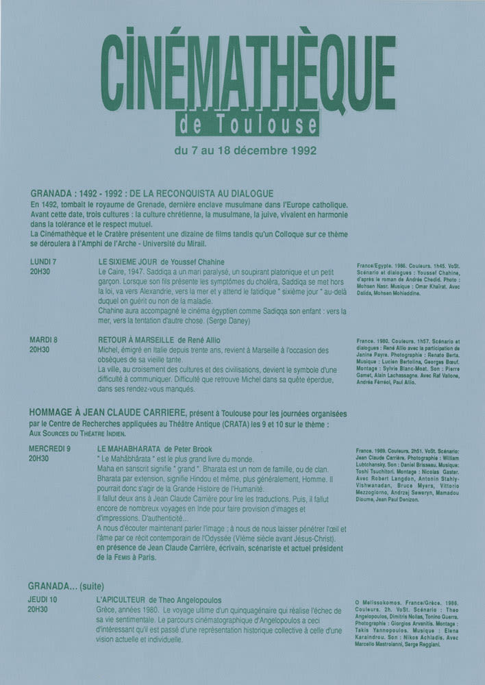 7 au 18 décembre 1992. Granada :1492-1992 : de la Reconquista au dialogue. Hommage à Jean-Claude Carrière. Classiques du cinéma. Histoire et cinéma