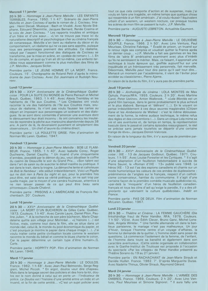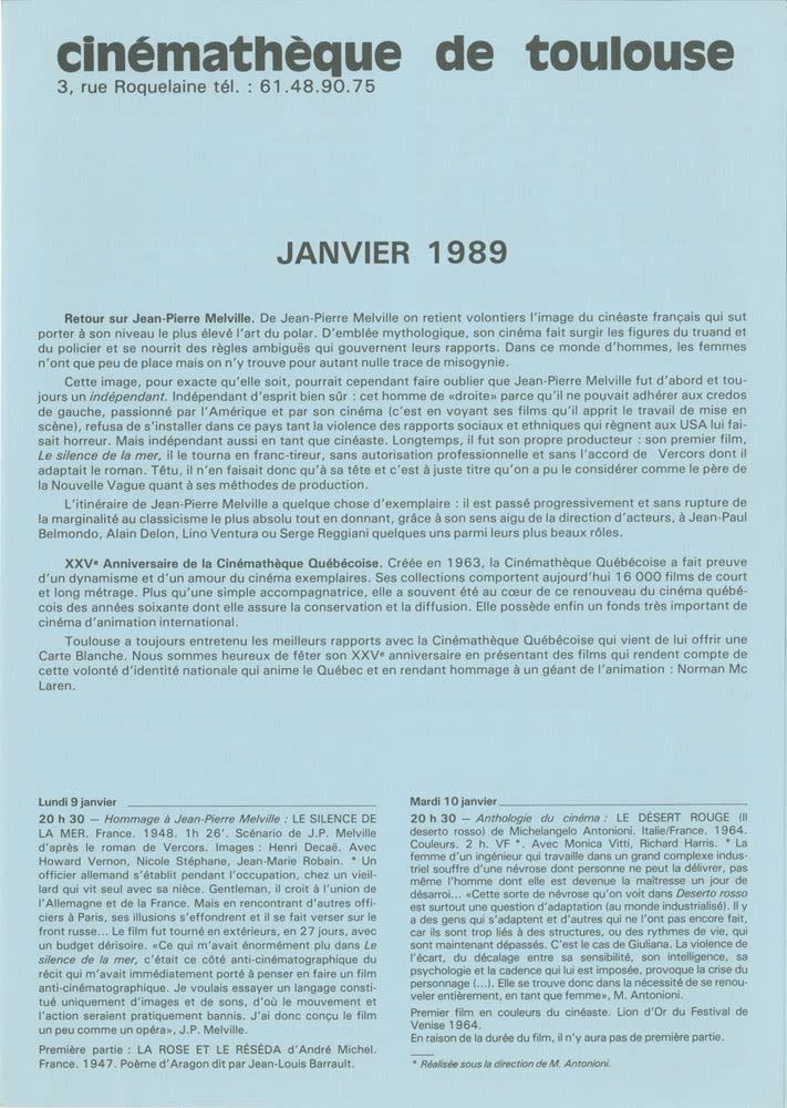 Janvier 1989. Hommage à Jean-Pierre Melville. Anthologie du cinéma. XXVe anniversaire de la Cinémathèque Québécoise. Théâtre et cinéma
