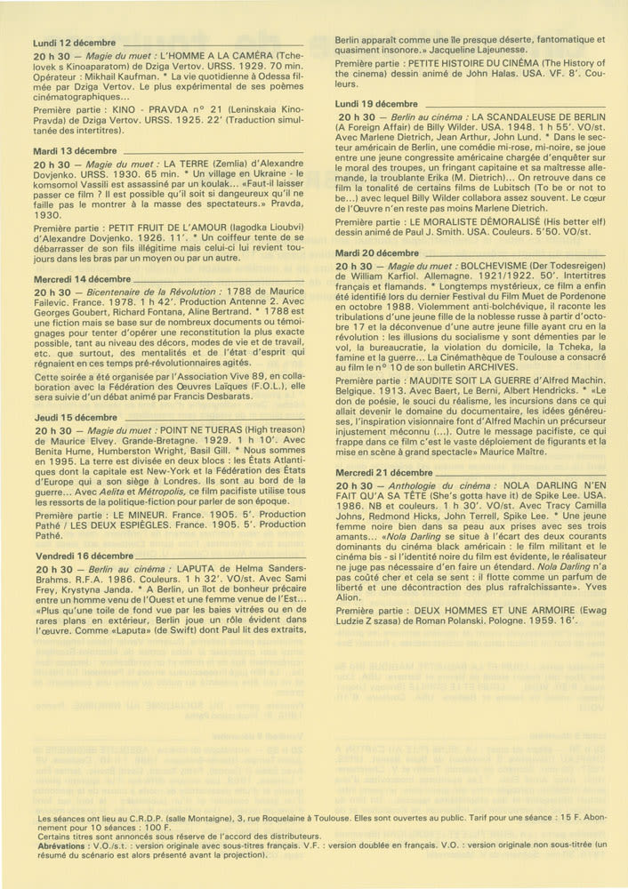 Décembre 1988. Magie du muet. Anthgologie du cinéma. Berlin au cinéma. Bicentenaire de la Révolution