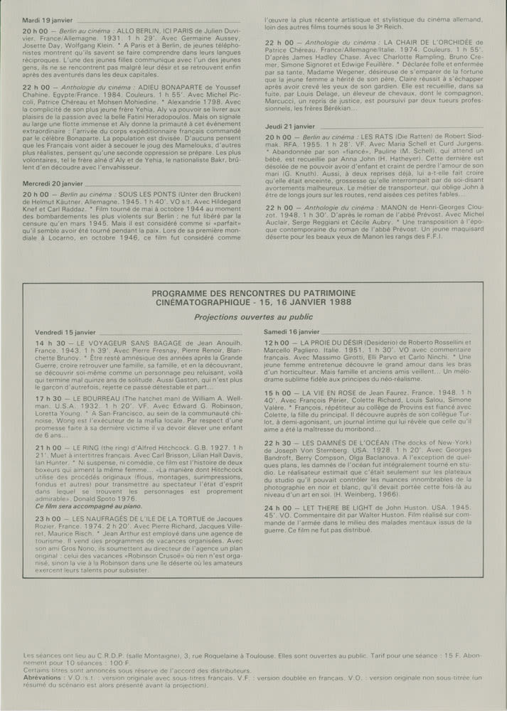 Janvier 1988. Hommage à Georges Franju. Anthologie du cinéma. Berlin au cinéma. Programme des rencontres du patrimoine cinématographique